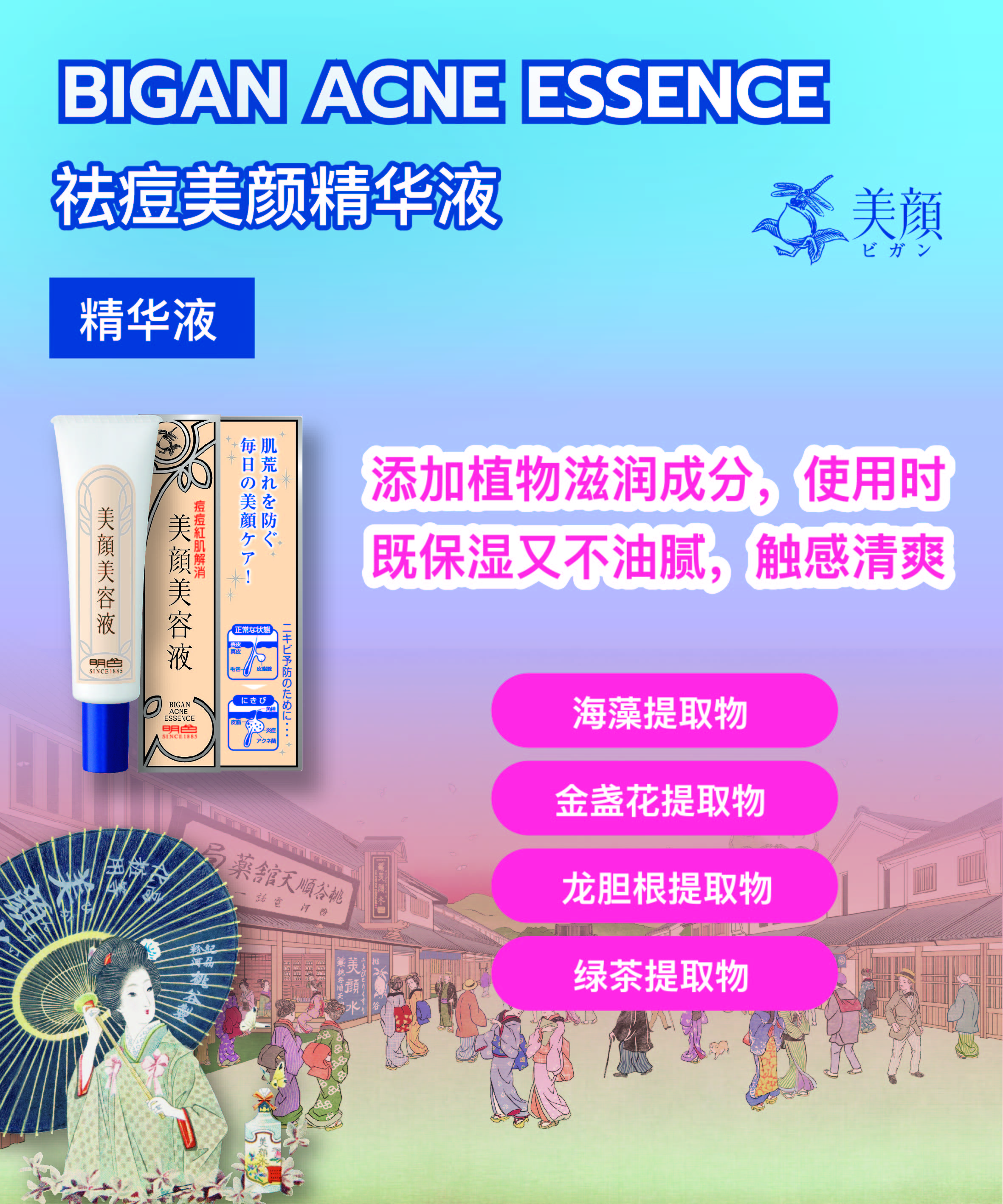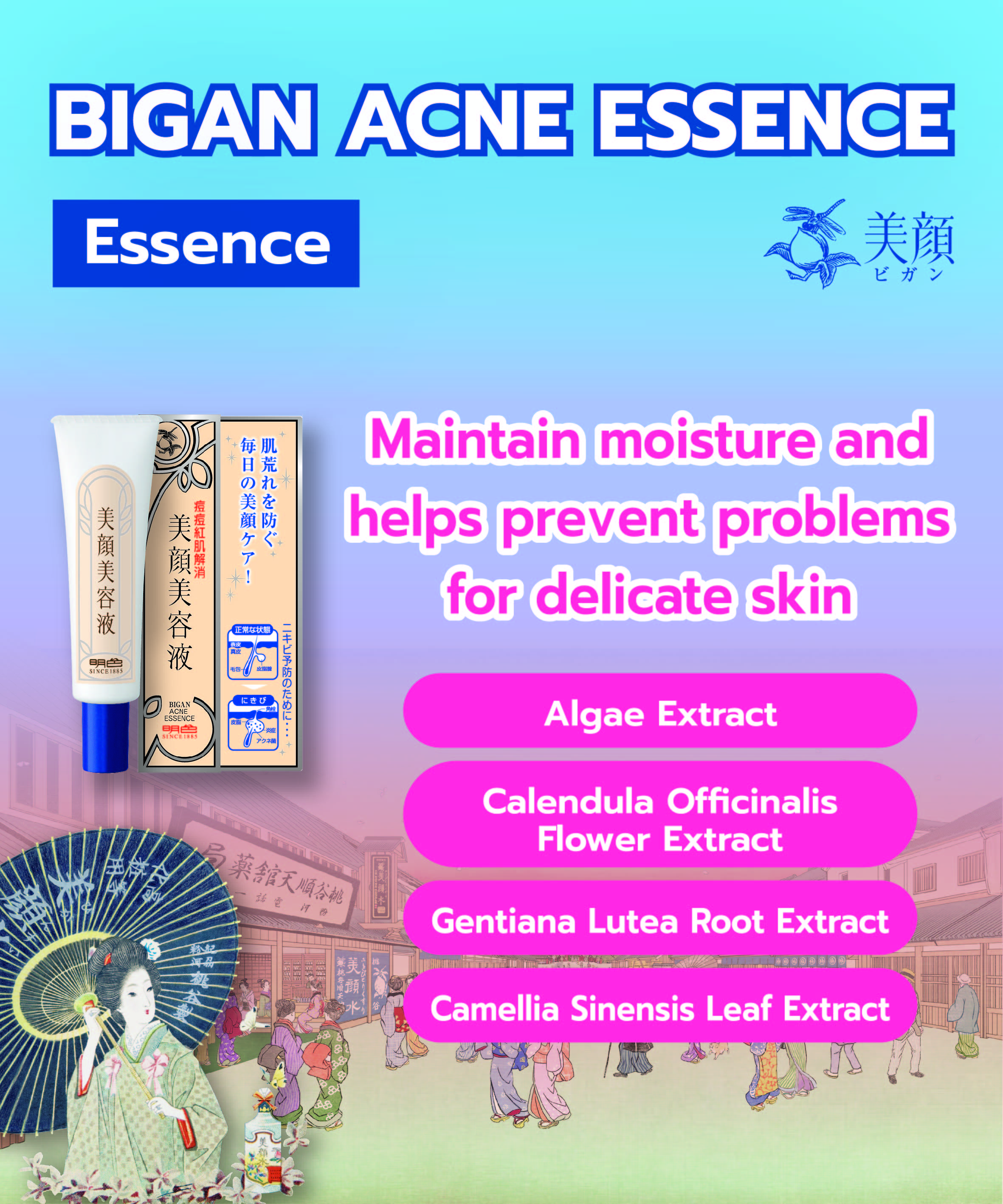 ผลิตภัณฑ์เอสเซ้นส์บำรุงผิวหน้า บำรุงผิวแห้งกร้าน ด้วยสารสกัดรากชะเอมเทศ คงความชุ่มชื้น ช่วยลดสาเหตุของการเกิดสิว ดูแลผิวบอบบาง ให้ความรู้สึกชุ่มชื้นหลังใช้ ไม่เหนียวเหนอะหนะ ด้วยสารบำรุงจากพฤกษาธรรมชาติ ได้แก่ สารสกัดจากสาหร่ายทะเล, สารสกัดจากดอกดาวเรือง, สารสกัดจากรากเจนเทียน่า และสารสกัดจากชาเขียว