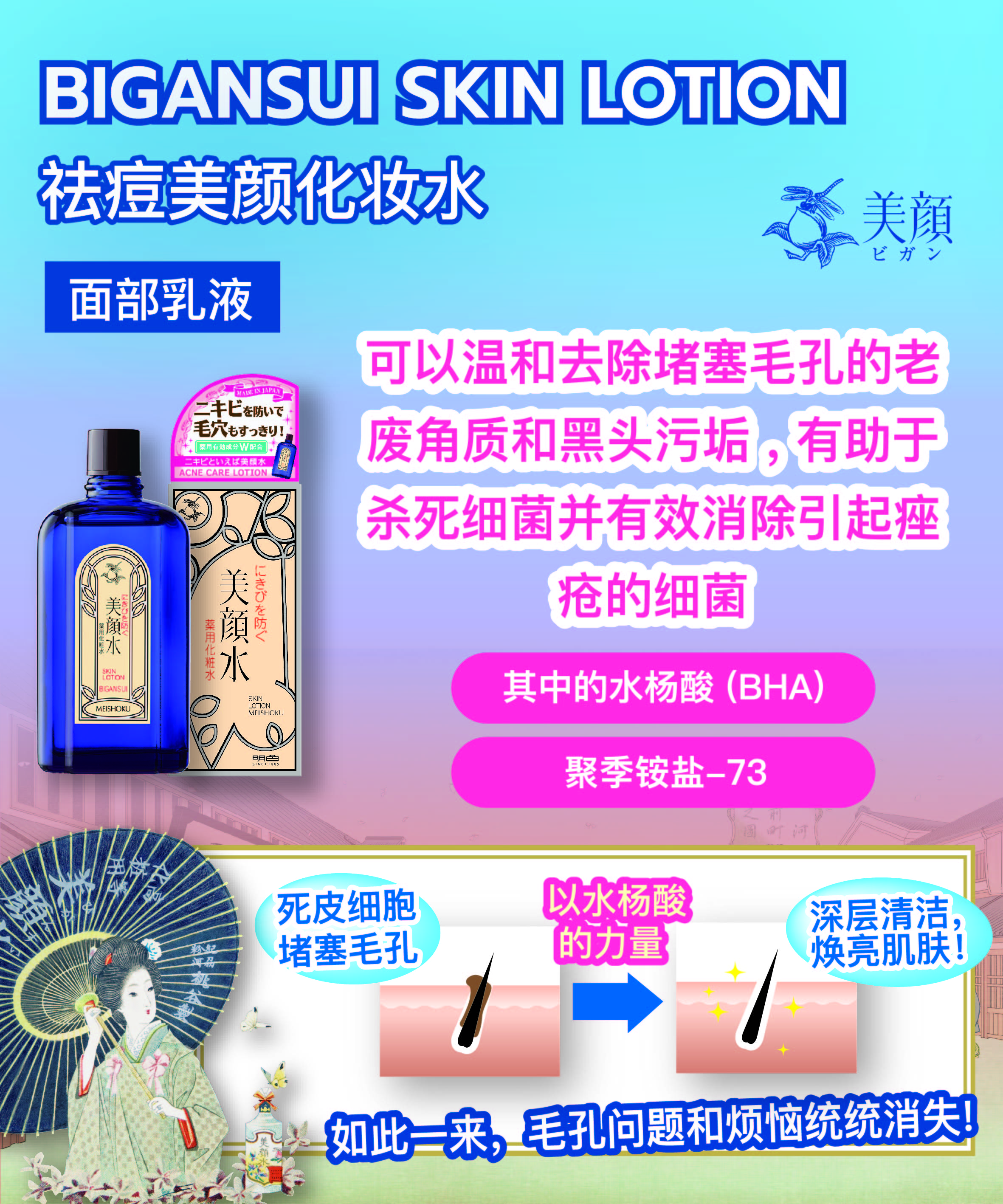 ผลิตภัณฑ์โลชั่นน้ำบำรุงผิวหน้า ประกอบด้วยกรดซาลิไซลิก (BHA) ช่วยขจัดสิ่งสกปรกอย่างอ่อนโยน เช่น เซลล์ผิวเก่าที่อุดตันรูขุมขน และรอยดำ โพลีควอเทอร์เนียม-73 ช่วยลดสาเหตุของการเกิดสิว ขจัดความมันส่วนเกิน ให้ผิวลื่นขึ้น สามารถใช้ทาบริเวณหลังได้