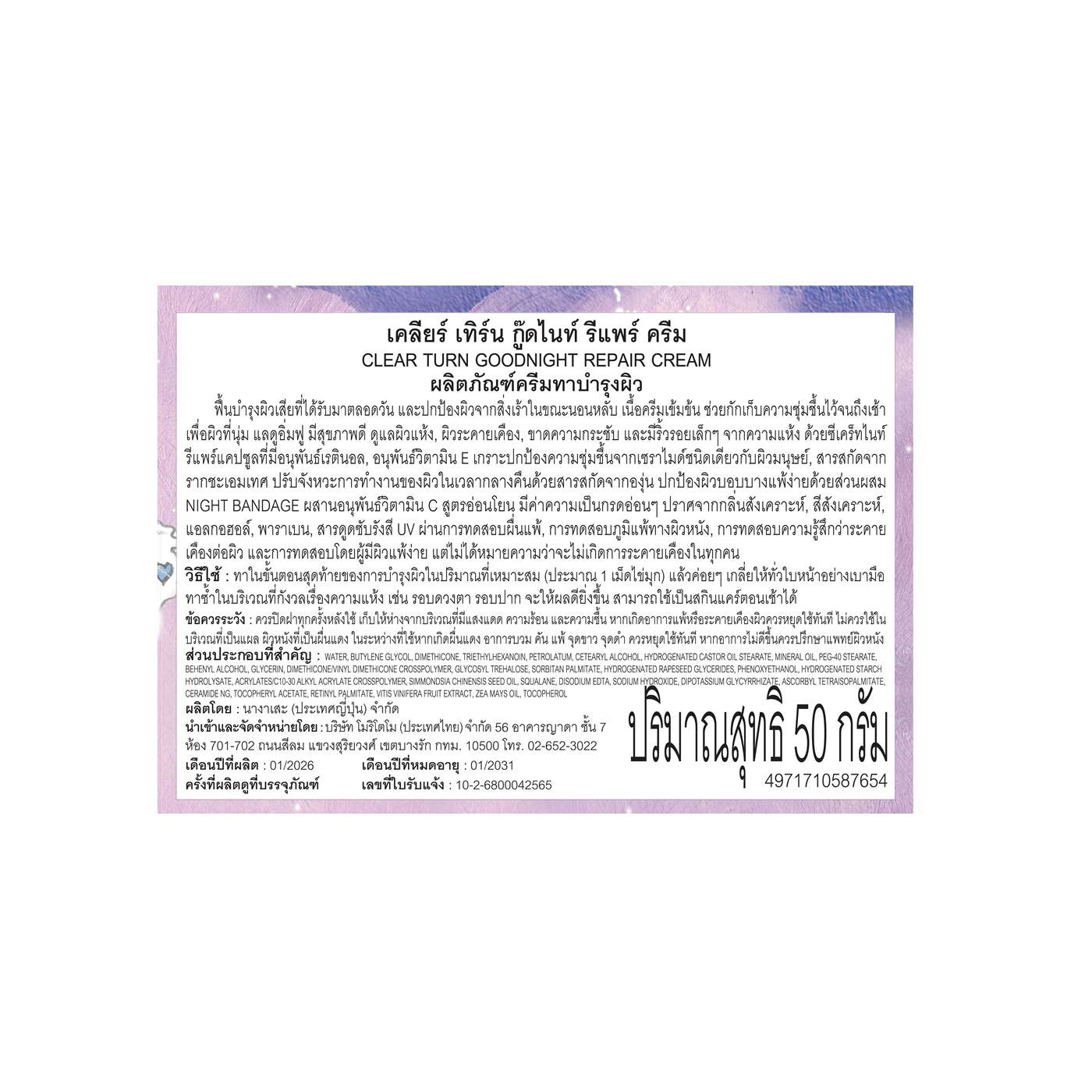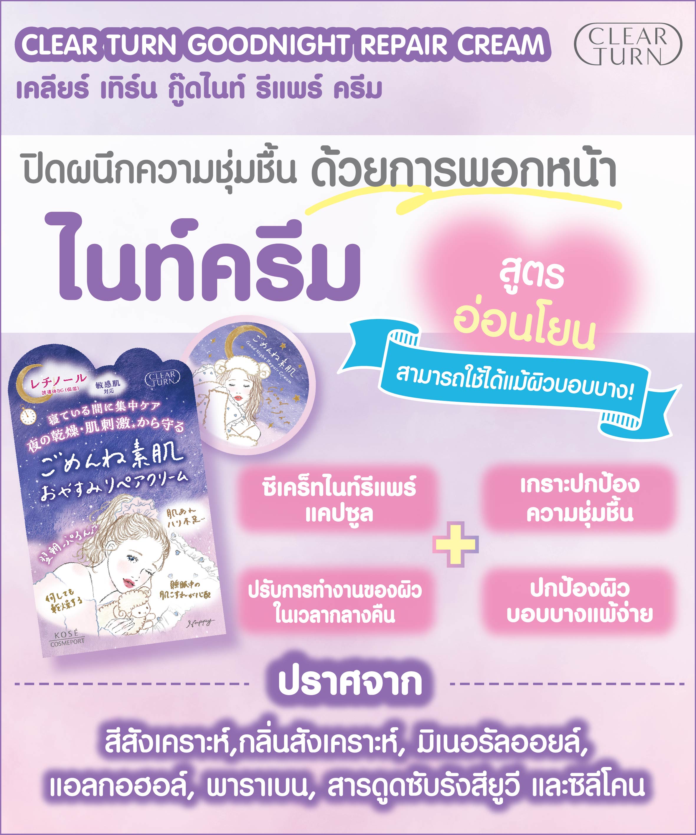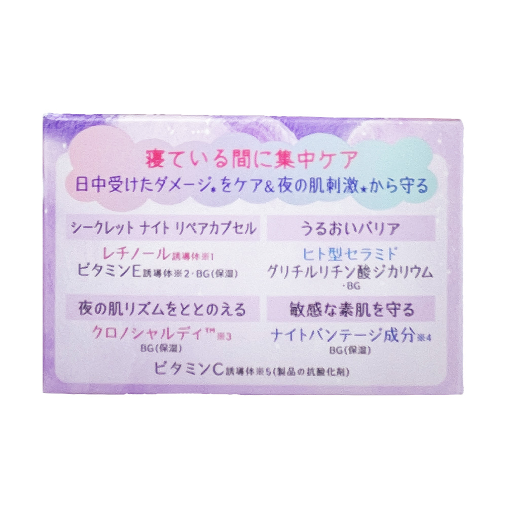 คำอธิบาย : ฟื้นบำรุงผิวเสียที่ได้รับมาตลอดวัน และปกป้องผิวจากสิ่งเร้าในขณะนอนหลับ เนื้อครีมเข้มข้น ช่วยกักเก็บความชุ่มชื้นไว้จนถึงเช้า เพื่อผิวที่นุ่ม แลดูอิ่มฟู มีสุขภาพดี ดูแลผิวแห้ง, ผิวระคายเคือง, ขาดความกระชับ และมีริ้วรอยเล็กๆ จากความแห้ง ด้วยซีเคร็ทไนท์รีแพร์แคปซูลที่มีอนุพันธ์เรตินอล, อนุพันธ์วิตามินE เกราะปกป้องความชุ่มชื้นจากเซราไมด์ชนิดเดียวกับผิวมนุษย์, สารสกัดจากรากชะเอมเทศ ปรับจังหวะการทำงานของผิวในเวลากลางคืนด้วยสารสกัดจากองุ่น ปกป้องผิวบอบบางแพ้ง่ายด้วยส่วนผสม Night Bandage ผสานอนุพันธ์วิตามินC สูตรอ่อนโยน มีค่าความเป็นกรดอ่อนๆ ปราศจากกลิ่นสังเคราะห์, สีสังเคราะห์, แอลกอฮอล์, พาราเบน, สารดูดซับรังสีUV ผ่านการทดสอบผื่นแพ้, การทดสอบภูมิแพ้ทางผิวหนัง, การทดสอบความรู้สึกว่าระคายเคืองต่อผิว และการทดสอบโดยผู้มีผิวแพ้ง่าย แต่ไม่ได้หมายความว่าจะไม่เกิดการระคายเคืองในทุกคน