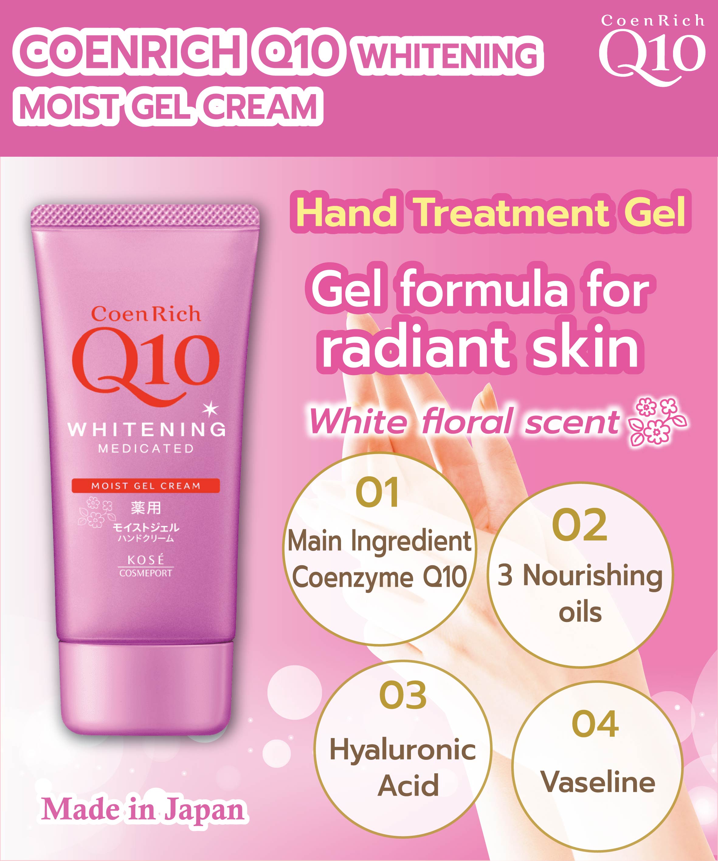 ครีมทาบำรุงผิวมือ สูตรเจลให้สัมผัสชุ่มฉ่ำ เพื่อผิวแลดูกระจ่างใส ด้วยส่วนประกอบของ โคเอนไซม์คิวเทน, กรดไฮยาลูรอน, วาสลีน, คอลลาเจน,ไนอะซินาไมด์