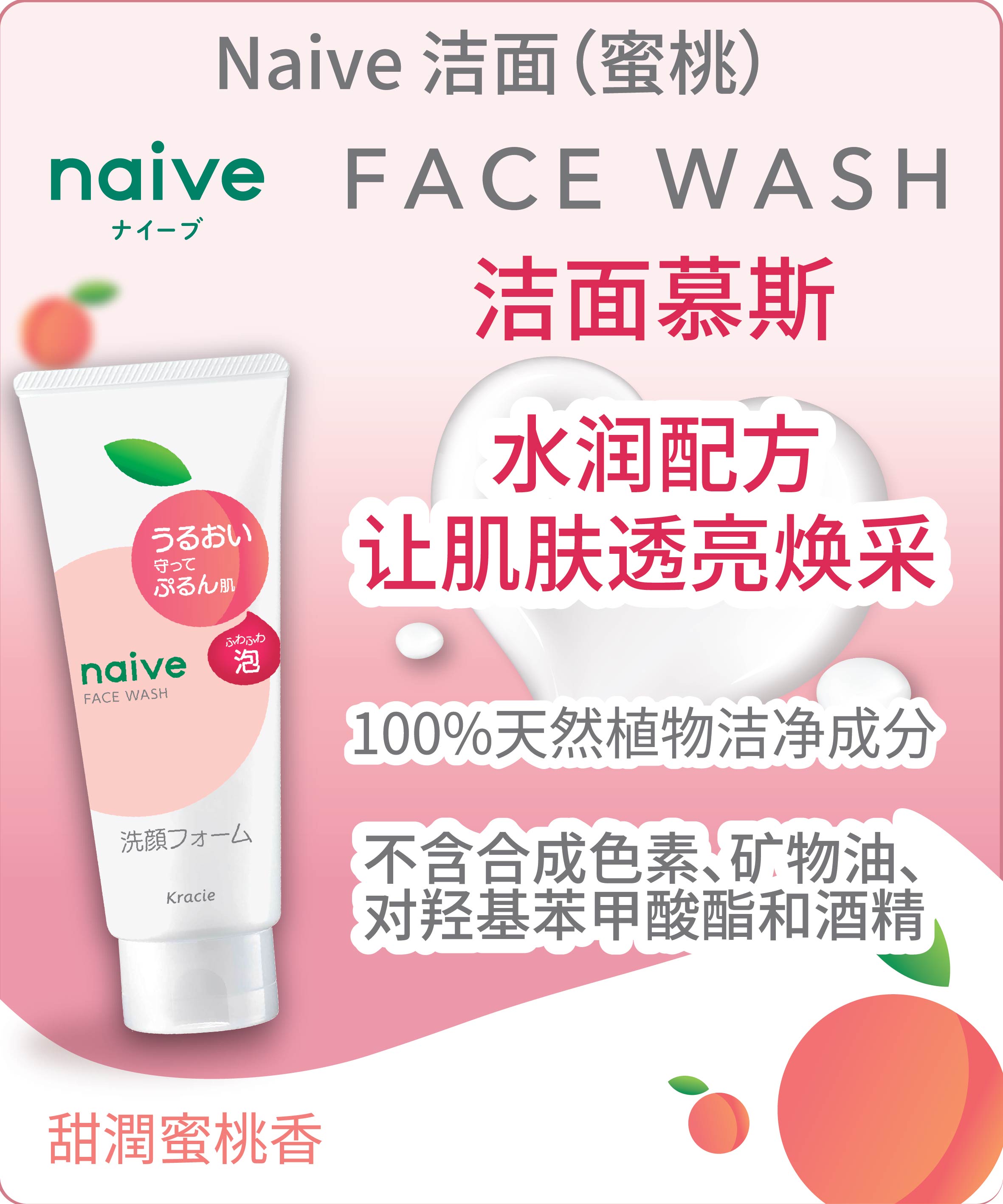 ประกอบด้วยสารสกัดจากใบพีช(สารให้ความชุ่มชื้น) เพื่อผิวเนียนฉ่ำ ฟองโฟมนุ่มฟูช่วยทำความสะอาดสิ่งสกปรกอย่างล้ำลึก