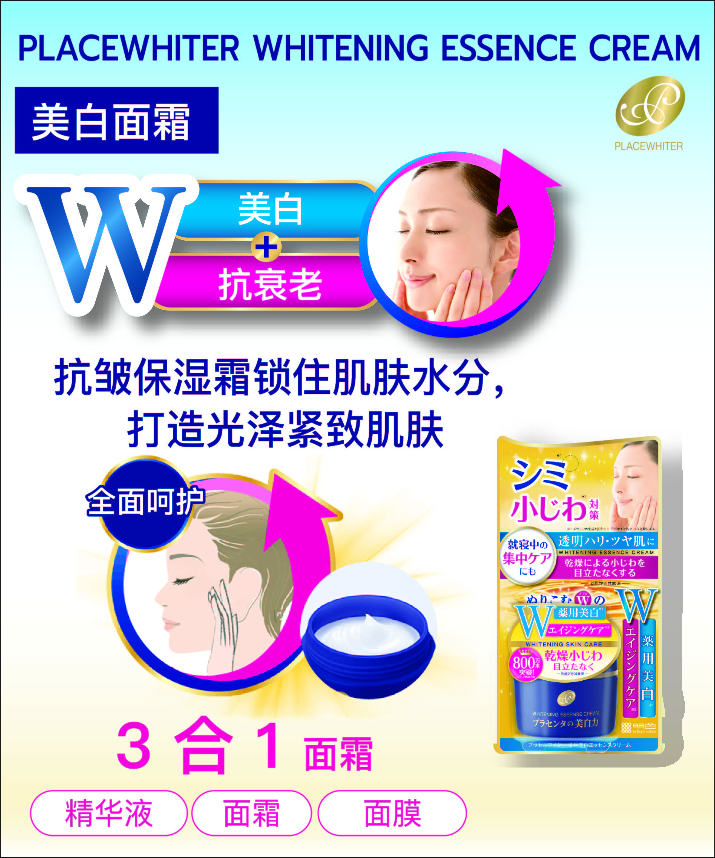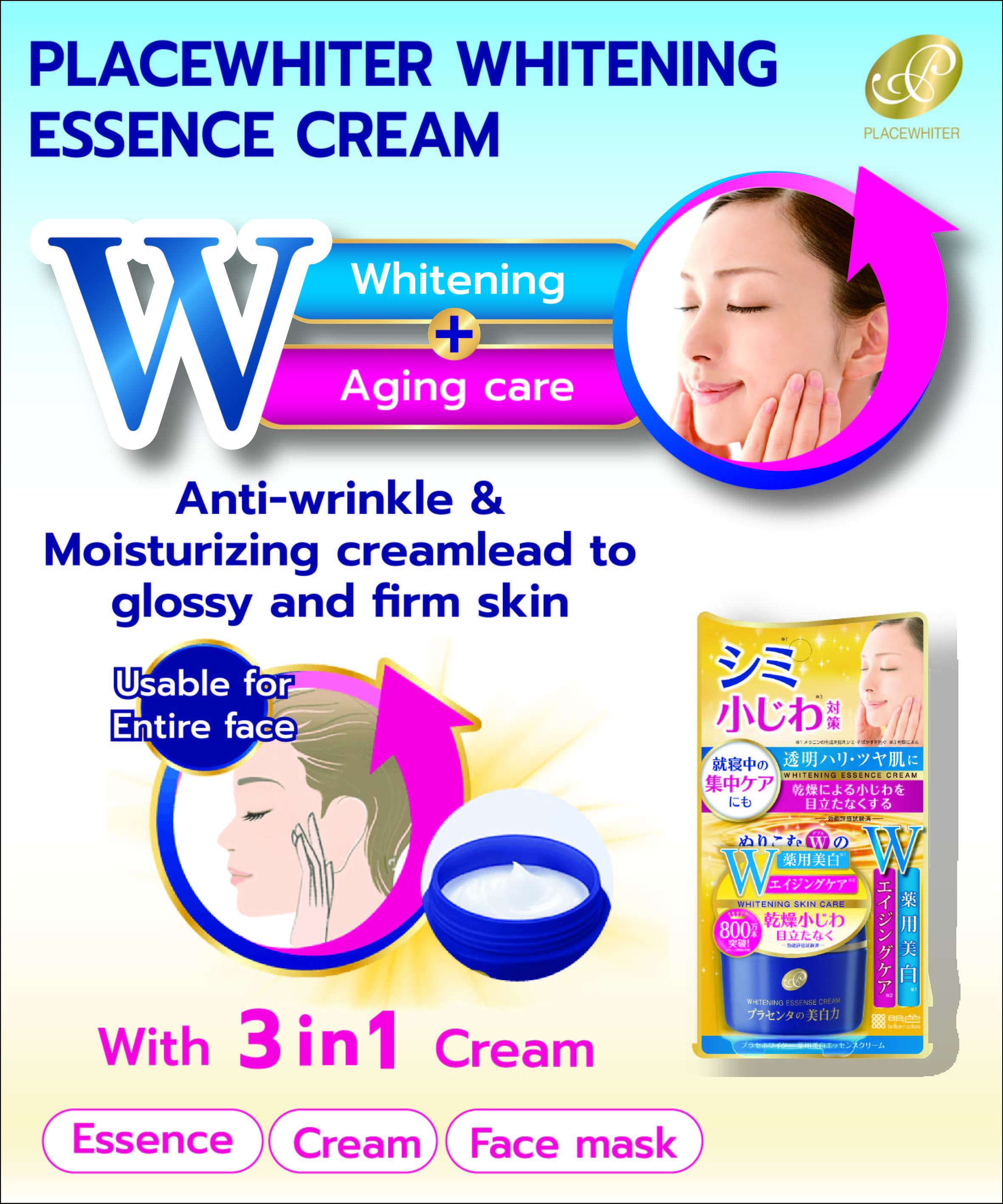 ผลิตภัณฑ์ครีมบำรุงผิวหน้า บำรุงผิวแห่งวัย ให้ผิวแลดูกระจ่างใส ช่วยให้ริ้วรอย และรอยดำแลดูจางลง ด้วย 3 คุณสมบัติใน 1 กระปุก ได้แก่ เอสเซ้นส์, ครีม และพอกหน้า เนื้อครีมเกลี่ยง่าย ซึมซาบดี ให้ความรู้สึกชุ่มฉ่ำ ประกอบด้วยพลาเซนต้า ที่ช่วยให้รอยดำแลดูจางลง ผิวแลดูกระจ่างใสขึ้น มีสารคงความชุ่มชื้นจากคอลลาเจน และสารสกัดจากลูกเดือย ช่วยให้ริ้วรอยแลดูจางลง ผิวกระชับ มีกลิ่นหอมของไวท์ฟลอรัล